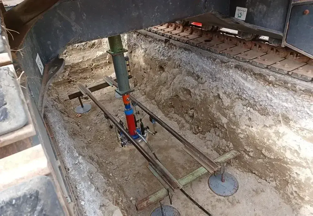 平板載荷試験は、実際の条件に近い荷重を地盤にかけて、その強度を確認する方法です。基礎を設置する深さまで掘削し、30cmの円盤に荷重をかけて沈下量を測定します。この方法により、地盤が建築物を安全に支持する力を評価します。